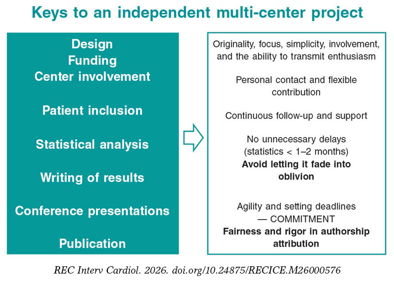 To successfully undertake a clinical research project, it is essential to define a clear and original objective with practical implications and to design a study that interferes as little as possible with routine clinical practice. Only essential and well-defined information should be requested. Flexible and individualized contributions from participating centers should be encouraged, prioritizing data quality over quantity. Maintaining close communication with collaborators —offering support during patient enrollment and follow-up—is also crucial. Furthermore, investigators must demonstrate a genuine commitment to the dissemination and publication of results and establish authorship structures that reflect the magnitude of each contribution while avoiding any form of favoritism (figure 2).