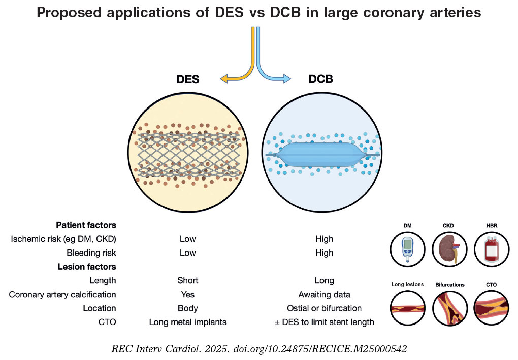 In this context, in a recent paper published in REC: Interventional Cardiology, Sorolla Romero et al. report a timely and rigorous meta-analysis of RCT comparing DCB with DES in patients with native large coronary artery disease (PROSPERO CRD42024602012).5 A total of 2961 patients (n = 1476 for DCB and n = 1485 for DES) from 7 RCT published from 2016 through 2024 were included, and, compared with DES, DCB were associated with a similar risk of the primary endpoint of target lesion revascularization, and all-cause and cardiovascular mortality, myocardial infarction, and major adverse cardiovascular events, but a > 2-fold risk of target vessel revascularization. For angiographic outcomes, although DCB caused less late lumen loss, they were associated with a smaller minimal lumen diameter at follow-up. In light of these results, we hereby hope to provide current and future perspectives on the role of DCB for treatment of native large coronary artery disease.