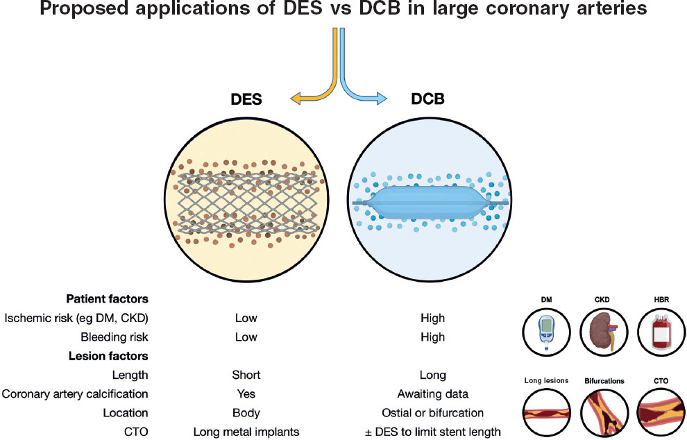 Figure 1. Patient and lesion factors to be taken into consideration when evaluating native large coronary artery disease for percutaneous coronary intervention. Presence of any one of the factors highlighted beneath DCB should lead the operator to contemplate an approach to limit the number of permanent coronary artery implants. ACS, acute coronary syndrome; CKD, chronic kidney disease; CTO, chronic total coronary occlusion; DCB, drug-coated balloon; DES, drug-eluting stent; DM, diabetes mellitus; HBR, high bleeding risk.