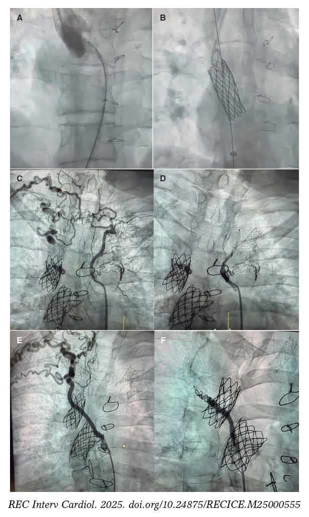 In our setting, the joint work model established since 2015 between pediatric and adult teams illustrates this philosophy. It is not just about sharing a cath lab but generating shared spaces for discussion and decision-making through multidisciplinary clinical sessions to standardize criteria and enable individualized strategy planning. A recent example reflecting the benefits of this collaborative model is a Fontan optimization case involving stenting and collateral closure. The patient was a 41-year-old woman with complex congenital heart disease and single-ventricle physiology—characterized by atrioventricular concordance with ventriculoarterial discordance, complete transposition of the great arteries, a large ventricular septal defect, pulmonary stenosis, and right ventricular hypoplasia—who had undergone multiple surgical procedures (Blalock–Taussig shunt at 13 months, systemic–pulmonary shunt at 2.5 years, bidirectional Glenn at 9 years, and extracardiac Fontan at 17 years). She exhibited reduced functional capacity and Fontan-associated hepatopathy. Cardiac catheterization confirmed a severely calcified Fontan conduit with significant stenosis at its insertion into the right pulmonary artery. Balloon sizing was performed, followed by implantation of a covered stent postdilated with a 20-mm balloon, achieving a good result. A marked stenosis at the Glenn-to–right pulmonary artery anastomosis was confirmed via right internal jugular vein, and a 34 mm bare-metal stent was implanted (figure 1A,B). The aortography performed via arterial access revealed the presence of large aortopulmonary collaterals supplying the 2 upper lung lobes, which were successfully occluded. The first one, toward the right and left upper lobes, was closed using an Amplatzer Vascular Plug 4 (Abbott Cardiovascular, United States) and coils; the second, toward the right upper lobe, was also closed with an Amplatzer Vascular Plug 4 and coils (figure 1C,F). This case illustrates the synergy between pediatric and adult interventional cardiologists in completing treatment.