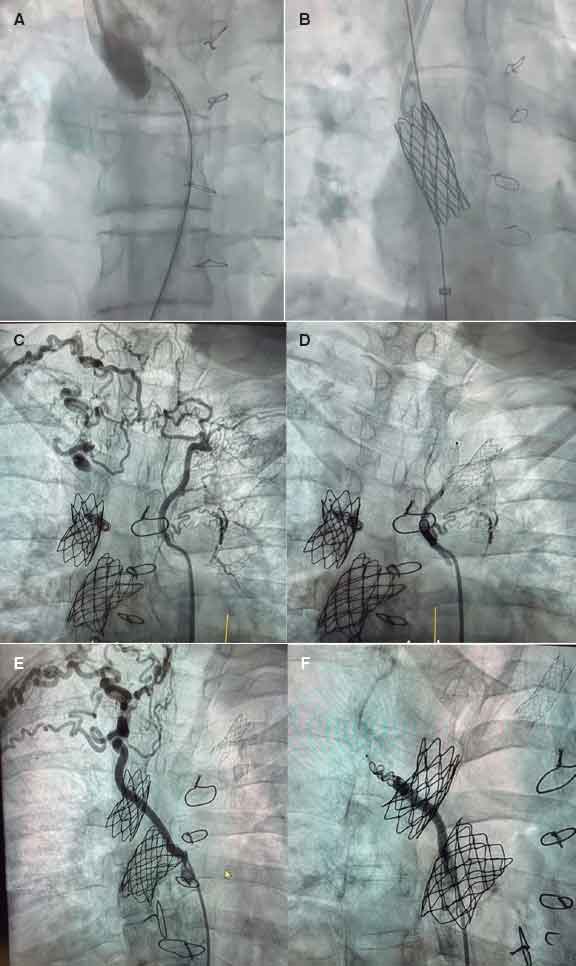 Figure 1. Fontan optimization. A: stenosis at the Glenn–right pulmonary artery anastomosis. B: bare-metal stent implanted in the stenosis. C: large aortopulmonary collateral supplying the right and left upper lung lobes. D: occlusion of this collateral. E: large aortopulmonary collateral supplying the right upper lobe. F: occlusion of the collateral.