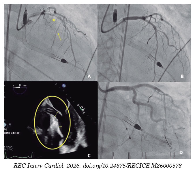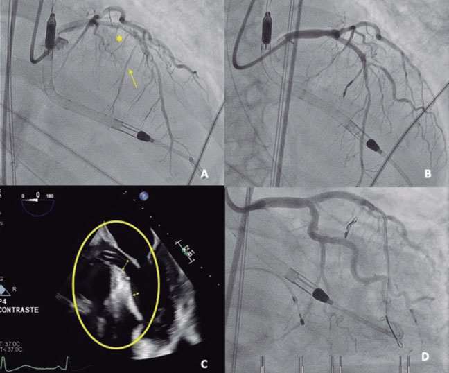 Implantation of the Impella-CP device (figure 1D, asterisk), with flow adjusted to 2.4 L/min (P4) to prevent suction, resulted in immediate hemodynamic and respiratory improvement, as well as a reduction in mitral regurgitation (figure 1E,F; arrows indicate the systolic S wave). A second septal branch (SB) showed extrinsic compression and was selected after confirmation of septal perfusion (figure 2A; arrow indicates second SB; asterisk: first SB). Two coils were deployed (figure 2B) due to potential reversibility, resulting in immediate flow reduction and DLVOTO improvement.