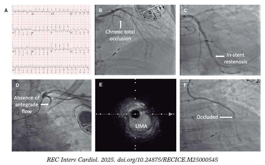 A 77-year-old man with a history of severe in-stent restenosis (ISR) of the left anterior descending (LAD) and left circumflex (LCx) arteries, treated with coronary artery bypass grafting 4 years earlier, presented with acute chest pain, right bundle branch block, and anterolateral ST-segment elevation (figure 1A). His blood pressure was 90/60 mmHg, and echocardiography demonstrated severely impaired left ventricular function without mechanical complications.