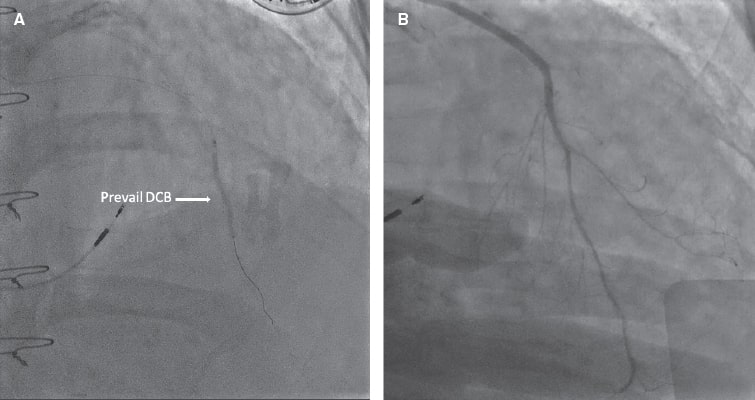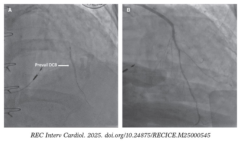 Afterwards, a Thrombuster II (Kaneka Corp., Japan) aspiration device was advanced into the mid LIMA. Contrast injection revealed an occlusion at the LIMA–LAD anastomosis (figure 1F, arrow). Although thrombectomy restored flow, severe stenosis persisted at the anastomosis site. Balloon angioplasty was performed, followed by the deployment of a 2.0 mm × 30 mm Prevail (Medtronic, United States) drug-coated balloon (DCB) across the graft and native LAD (figure 2A, arrow). Final angiography demonstrated excellent runoff (figure 2B; video 2), ST-segment resolution, and hemodynamic improvement.