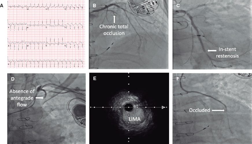Emergency angiography revealed a chronic total occlusion in the LAD (figure 1B, arrow), severe ISR in the LCx (figure 1C, arrow), and an occluded native right posterior descending artery. The graft to this artery was patent but diseased, and there was no antegrade flow in the left internal mammary artery (LIMA)–LAD graft (figure 1D; video 1). An intra-aortic balloon pump was inserted, and the LIMA–LAD graft was successfully wired with a workhorse guidewire. IVUS of the proximal to mid LIMA confirmed intraluminal position without evidence of dissection or graft disease (figure 1E).