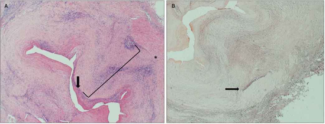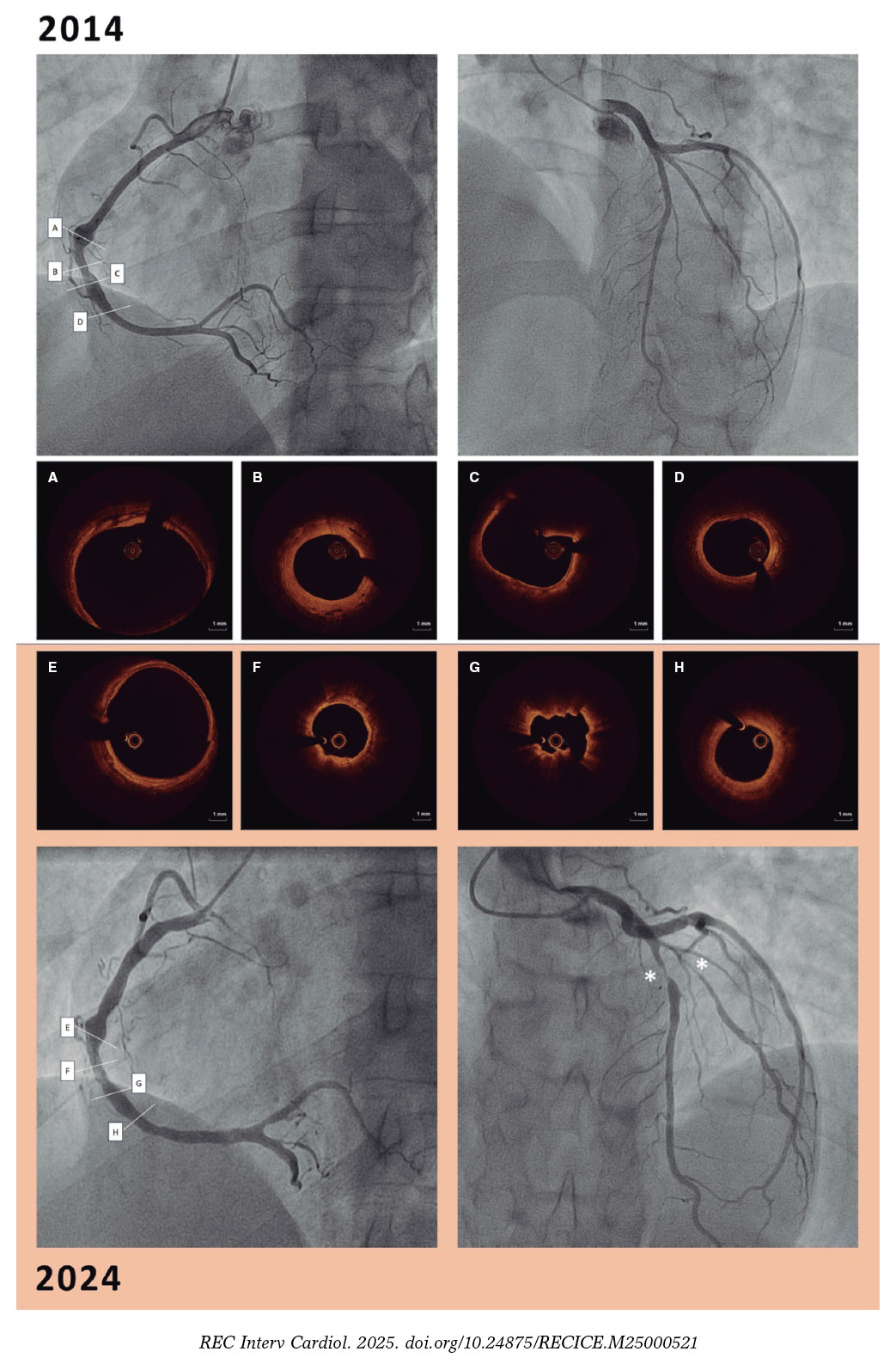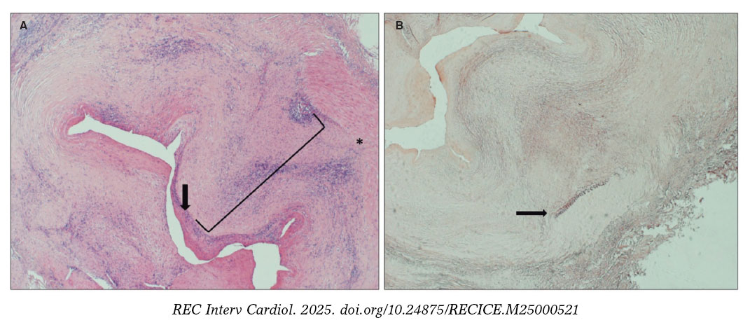 In 2024, repeat coronary angiography for exertional angina showed RCA disease progression with larger mid-RCA calcification, confirmed by OCT of the same artery segment. Furthermore, the distal segment showed disease progression with intima thickening and medial disruption (figure 1; figure 1E-1H). A new critical stenosis was found in the left anterior descending coronary artery. Furthermore, a biopsy was obtained from an aneurysmal segment of the temporal artery (figure 2). Histopathological findings were similar to those seen on the OCT of coronary arteries. The thickened arterial wall was characterized by fibrous/myofibroblastic intimal hyperplasia, acute inflammatory infiltrate, necrosis, and fibrinoid changes (figure 2A-arrow). Moreover, a loss of the internal elastic lamina (figure 2B-arrow and figure 2A- asterisk) and adventitial vessels confirmed the presence of perivascular chronic inflammation.
