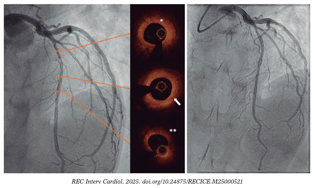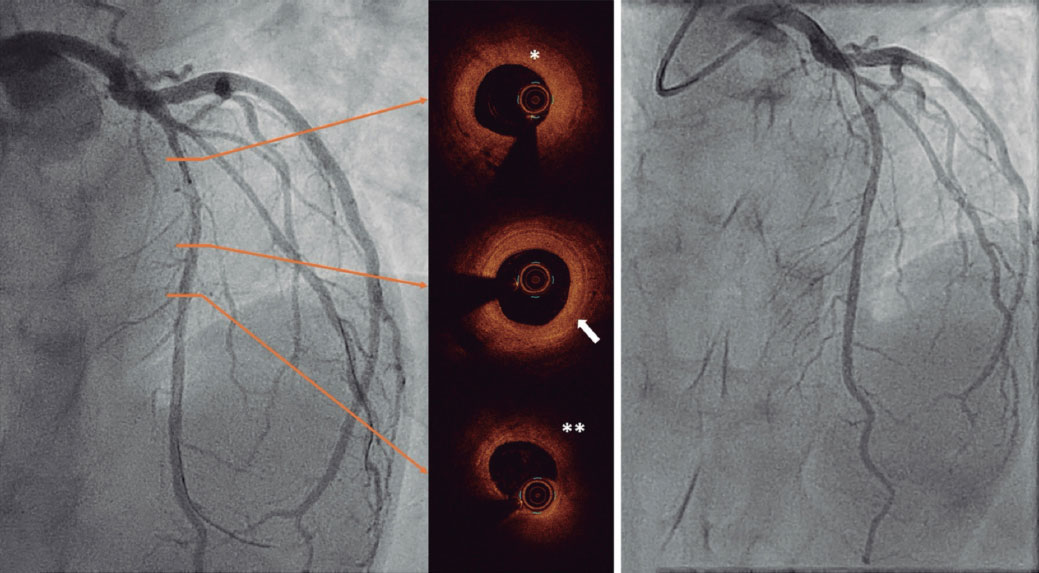 Based on the symptoms and left anterior descending coronary artery findings (intimal thickening and medial disruption, suggestive of vasculitis; figure 3A, asterisk and arrow), with a healthy distal vessel (figure 3A, double asterisk). A transcatheter coronary intervention with drug-coated balloon was performed (figure 3B).