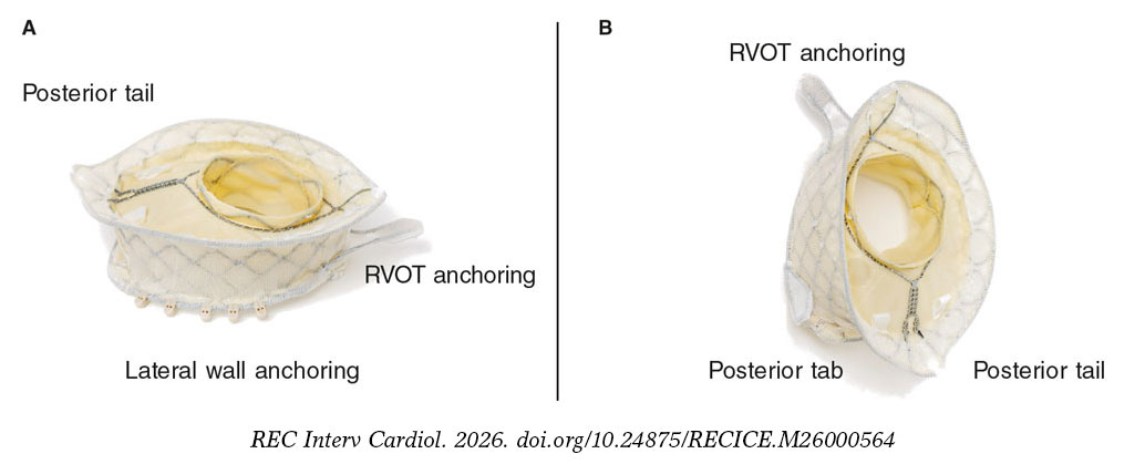 Transcatheter tricuspid valve replacement (TTVR) is an emerging alternative for patients at high surgical risk with isolated, severe, and symptomatic tricuspid regurgitation, particularly when anatomy is not amenable to transcatheter repair. This is the first case ever reported in Spain of TTVR using the new VDyne Valve (VDyne, United States), a transcatheter valve designed to preserve the asymmetric morphology of the tricuspid annulus. The device consists of a nitinol dual-frame structure housing a 30-mm trileaflet porcine valve. The asymmetric outer frame accommodates annular diameters ranging from 42 to 56 mm and is secured through anchoring to the right ventricular outflow tract (RVOT), using fixation tabs along the free wall, a posteroseptal tab, and a ventricular tail (figure 1). The device is vertically mounted on a 32-Fr femoral delivery system. Compared with other TTVR systems, its advantages include anchoring that is independent of native leaflet visualization or support, minimal interaction with the right ventricular apex, and the ability to achieve full recapture and repositioning after intracardiac deployment.