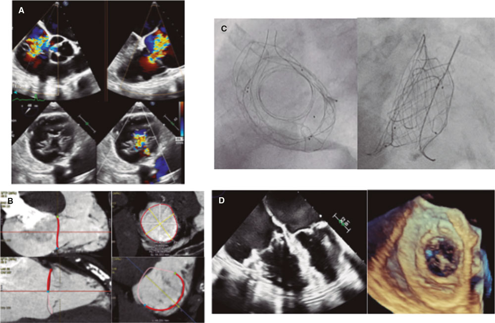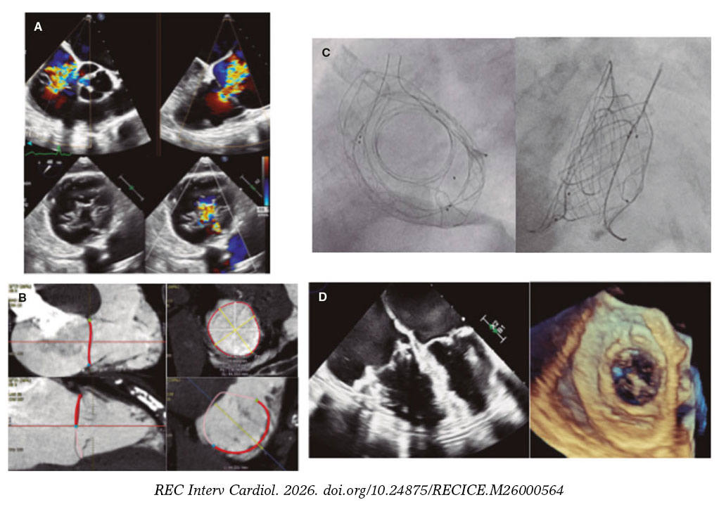 The procedure was performed in an 81-year-old woman with symptomatic disease (TRI-SCORE, 6) (New York Heart Association functional class IV, ambulatory), massive functional tricuspid regurgitation (effective regurgitant orifice width, 9 mm), and a tricuspid annulus perimeter of 137 mm (figure 2A-B). The VDyne valve (size 1 with 6% oversizing) implanted under fluoroscopic and echocardiographic guidance achieved the complete resolution of tricuspid regurgitation as confirmed by angiographic, echocardiographic, and postoperative computed tomography imaging (figure 2C-D and videos S1-S4). The patient was discharged on postoperative day 5 with marked clinical improvement, corresponding to NYHA functional class II and an increased distance on the 6-minute walk test (+90 m). This case reinforces the potential role of TTVR using dedicated valves in patients with no previous therapeutic alternatives.