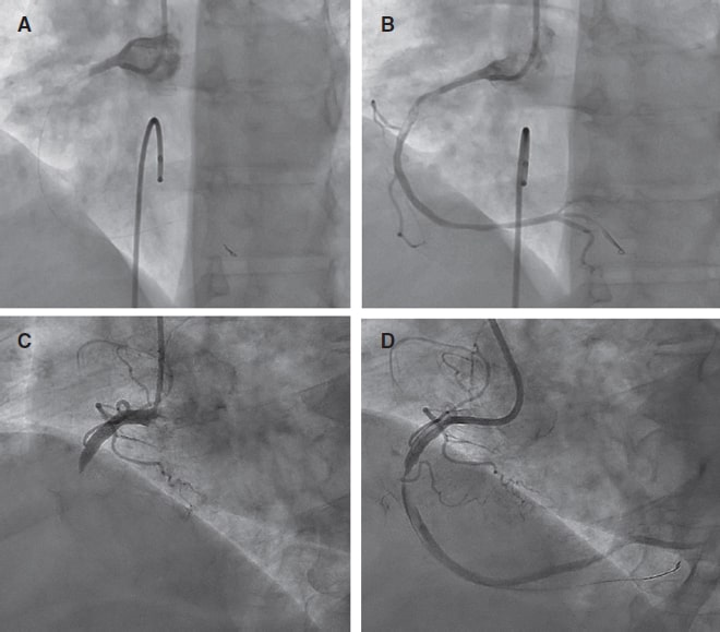 Thrombus removal, particularly when dealing with a large thrombus burden (LTB) in the context of STEMI, remains a critical and sometimes challenging aspect of PCI. Excimer laser coronary angioplasty (ELCA Coronary Laser Atherectomy Catheter, Koninklijke Philips N.V., The Netherlands) is a well-established adjuvant therapy for coronary interventions. ELCA uses xenon-chloride gas as the lasing medium to produce UV light energy, which is delivered to the target site through an optical fiber. This energy has the ability to ablate inorganic material through photochemical, photothermal, and photomechanical mechanisms.6,7 The microparticles released during laser ablation measure < 10 µm and are absorbed by the reticuloendothelial system, theoretically reducing the risk of microvasculature obstruction.8 These unique characteristics of ELCA have facilitated its use as an adjuvant therapy in patients with STEMI to ablate and remove thrombus.