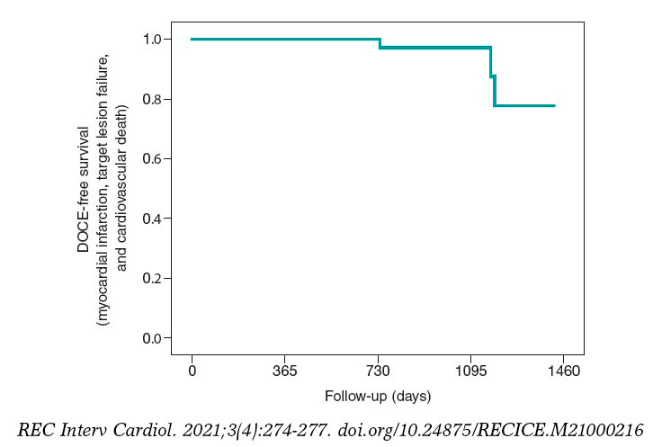 Figure 1. Kaplan-Meier survival curve with respect to the study primary endpoint: a device-oriented composite endpoint of target vessel myocardial infarction, target lesion failure, and cardiovascular death. DOCE, device-oriented composite endpoint.