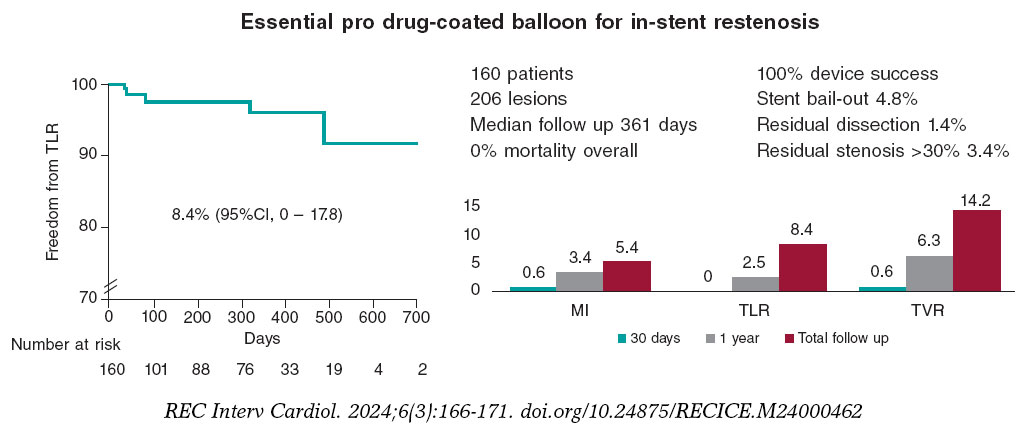 Figure 1. Central illustration. Main findings on the safety and efficacy of the Essential Pro drug-eluting balloon in patients with in-stent restenosis. Kaplan-Meier shows freedom from TLR. MI, myocardial infarction; TLR, target lesion revascularization; TVR, target vessel revascularization.