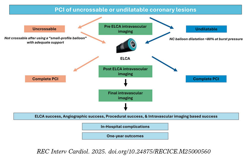 Métodos: Se trata de un estudio observacional prospectivo, abierto, multicéntrico e iniciado por los investigadores. Se incluirán pacientes con indicación de ICP y lesiones coronarias no dilatables (dilatación con balón no distensible < 80% a presión de ruptura) o no cruzables (no cruzables con un balón de bajo perfil y adecuado soporte, a criterio del operador) tratados con ELCA. Se recomendará el uso de imagen intravascular, que se analizará en un laboratorio central. Se evaluarán el éxito del dispositivo, el éxito angiográfico, el éxito del procedimiento, el éxito clínico y las complicaciones asociadas. Se seguirá a los pacientes durante 1 año tras el procedimiento y se registrarán los eventos clínicos.
