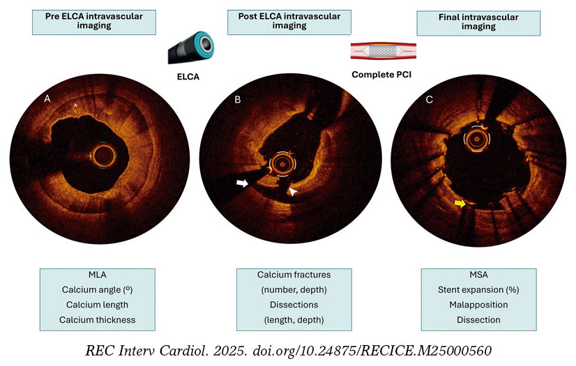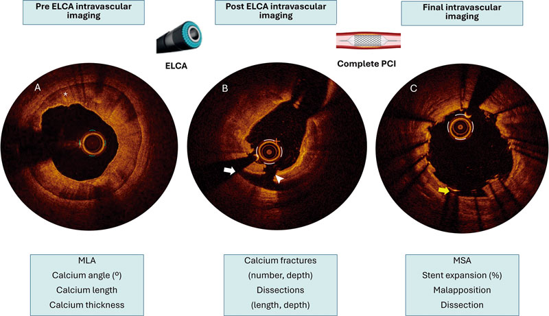 Figure 2. Example of the advised intracoronary imaging assessment in LUDICO study. A: baseline optical coherence tomography (OCT) image of a severely calcified lesion. The asterisk points to a calcium arc of 360° with a maximum thickness of 0.9 mm. B: OCT image after ELCA with contrast media. White arrow points to a dissection. The white arrowhead points to a deep calcium fracture. C: results after stenting. The yellow arrow points to a small area of malapposition. ELCA, excimer laser coronary atherectomy; MLA, minimal lumen area; MSA, minimal stent area; PCI, percutaneous coronary intervention.