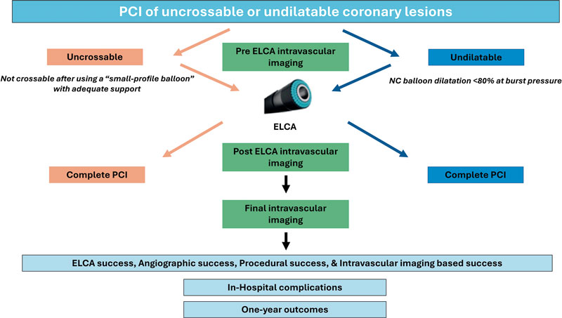 Methods: This will be an investigator-initiated, multicenter, single-arm, open-label, prospective observational study. Patients with an indication for PCI and undilatable (non-compliant balloon dilatation < 80% at burst pressure) or uncrossable (uncrossable with a “small-profile balloon” with adequate support, left to the operator’s discretion) coronary artery lesions treated with ELCA will be included. Intravascular imaging will be highly advised and analyzed in a core laboratory. Device success, angiographical success, procedural success, clinical success and related complications will be evaluated. Patients will be postoperatively followed for 1 year and clinical events will be recorded.