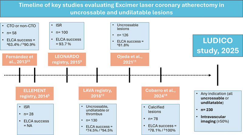 Figure 3. Timeline of key studies evaluating ELCA in uncrossable and undilatable lesions. CTO, chronic total coronary occlusion; ELCA, excimer laser coronary atherectomy; NA, not available; ISR, in-stent restenosis. a Uncrossable lesions. b Undilatable lesions.