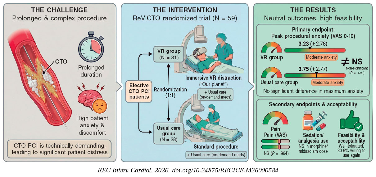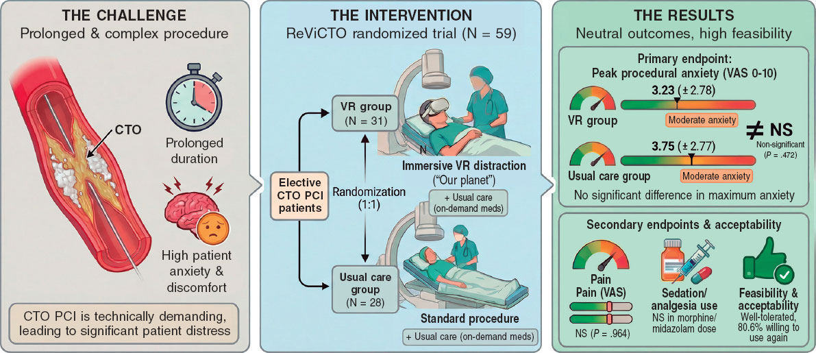 The ReViCTO trial was designed to test whether VR use during elective CTO PCI reduces the maximum level of patient-reported procedural anxiety vs usual care. Secondary endpoints included procedural pain, the use and dose of intraoperative anxiolytic or analgesic drugs, and patient satisfaction with the VR intervention. Figure 1 summarizes the main findings.