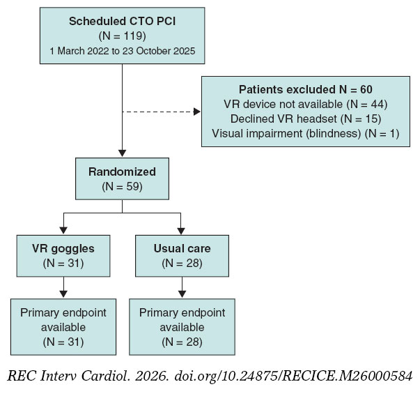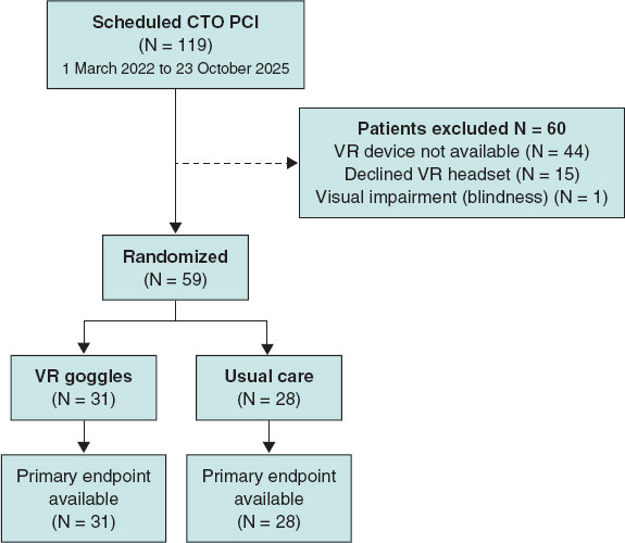 Between 1 March 2022 and 23 October 2025, a total of 119 scheduled CTO PCI were performed. Fifteen patients declined the use of the headset, and in 44 cases the VR device was not available. One patient was excluded due to visual impairment (blindness). Overall, 59 patients were randomized to VR goggles (n = 31) or usual care (n = 28), as shown in figure 2.