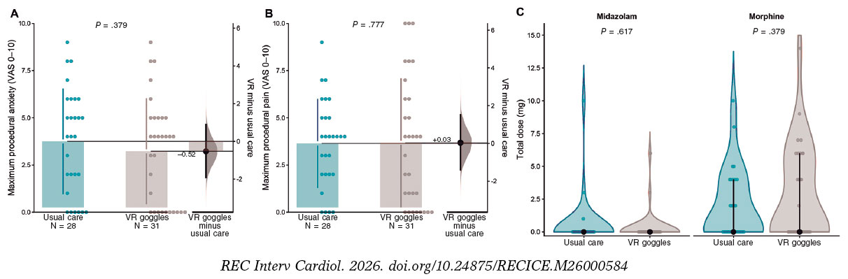 Conclusiones: En los pacientes sometidos a ICP electiva de OTC, el uso de RV inmersiva, en comparación con la atención habitual contemporánea, fue factible y bien tolerado, pero no redujo de manera significativa la ansiedad máxima ni el dolor percibidos por el paciente, y tampoco los requerimientos farmacológicos durante el procedimiento.