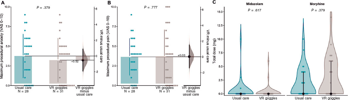 Figure 3. Patient-reported procedural anxiety and pain, and intraoperative drug use. A: maximum procedural anxiety assessed immediately after the procedure using a visual analogue scale for anxiety (VASa; 0–10). B: maximum procedural pain assessed using a visual analogue scale for pain (VASp; 0–10). C: total intraoperative dose (mg) of midazolam and morphine by treatment group; zero values indicate no drug administration. In panels A and B, dots represent individual patients; the right-side estimation plot shows the mean between-group difference (VR minus usual care) with its 95% confidence interval. P values correspond to prespecified between-group comparisons. VAS, visual analogue scale; VR, virtual reality.