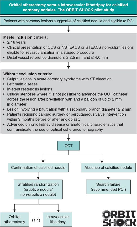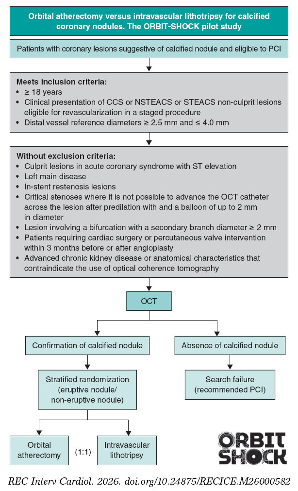 Métodos: El estudio piloto ORBIT-SHOCK es un ensayo clínico aleatorizado y multicéntrico que incluirá 50 pacientes con NC identificados mediante tomografía de coherencia óptica y candidatos a intervención coronaria percutánea. Los pacientes se asignarán aleatoriamente en una proporción 1:1 para recibir AO o LIV, con una aleatorización estratificada basada en el tipo de NC (eruptivo o no eruptivo) para garantizar una distribución equilibrada entre los grupos de tratamiento. El objetivo primario del estudio es la expansión del stent en el sitio del NC evaluada por tomografía, mientras que los objetivos secundarios son el éxito del procedimiento, el éxito de la estrategia, la aposición del stent y la incidencia de eventos clínicos adversos, como el fallo de la lesión diana, el fallo del vaso diana y los eventos cardiovasculares mayores a los 12 meses de seguimiento.