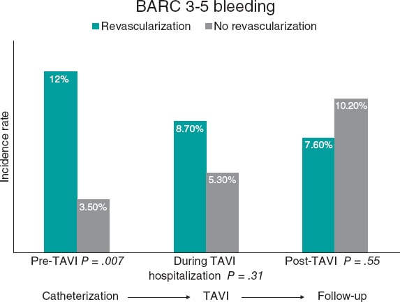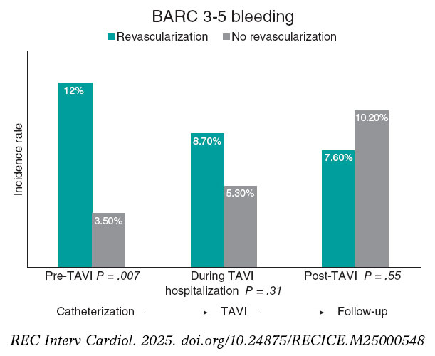 Our group recently published data showing that systematic, complete revascularization in patients undergoing TF-TAVI does not provide prognostic benefit in terms of mortality or major adverse cardiovascular events (MACE) (a composite of death, myocardial infarction, stroke, and heart failure-related hospitalization.)7 Given the high rate of bleeding events in these patients, it is of substantial clinical interest to evaluate whether revascularization may confer an increased bleeding risk and assess its clinical impact.6