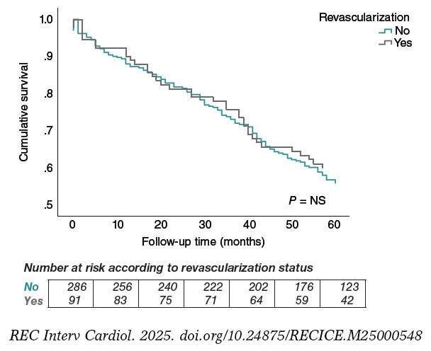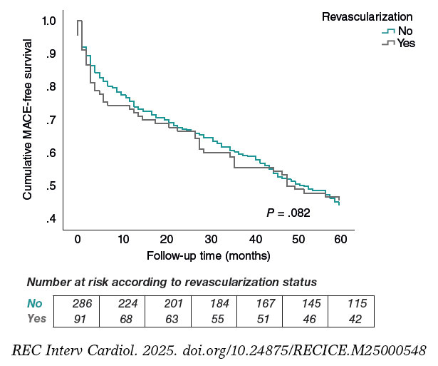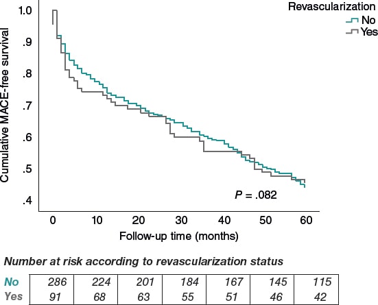 After a mean follow-up of 60 months, 55.1% (209/379) of patients experienced MACE: 55.7% in the nonrevascularized group (160 patients), and 53.2% in the revascularized group (49 patients). There were no statistically significant differences (P = .082) (figure 2). The overall mortality rate at 60 months was 42.2% (161/378): 43.7% in nonrevascularized patients (125 patients), and 39.0% in revascularized ones (36 patients). Again, no significant differences were reported (P = .380) (figure 3).