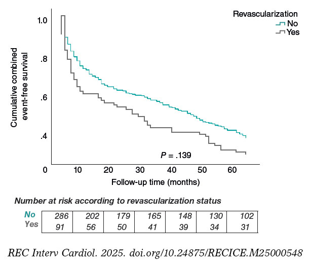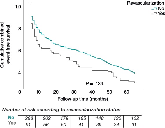 After a mean 60-month follow-up, the composite endpoint (MACE or major bleeding) occurred in 62.0% (235 patients) of the total sample, without significant differences across the groups (66.3% nonrevascularized vs 60.6% revascularized; P = .139) (figure 4).