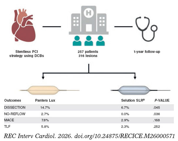 The SELUTION SLR (Cordis, United States) aimed to overcome the unfavorable pharmacodynamics of sirolimus by incorporating microreservoirs and a phospholipid coating designed for controlled, sustained release of sirolimus over 90 days. Preclinical and early clinical evidence suggests favorable vessel healing, drug retention, and patency.5 However, comparative data vs paclitaxel-based DCBs in de novo lesions remain limited. Given the evolving landscape of interventional cardiology and increasing interest in no-footprint PCI, a direct head-to-head evaluation of the safety and efficacy profiles of these 2 DCB platforms is warranted.