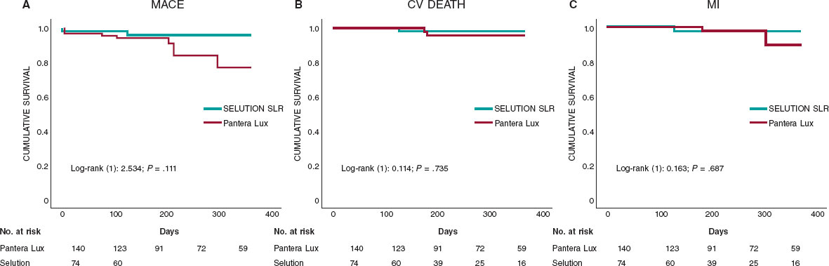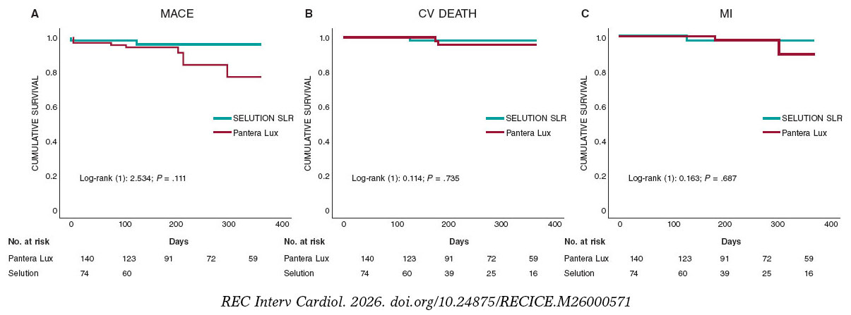 Clinical follow-up at 12 months was available for all patients, whereas angiographic follow-up was performed in 35.4% of lesions (n = 91) at the operator’s discretion and was not protocol mandated. At the patient level, the overall rates of adverse clinical events were low (table 4). All-cause mortality occurred in 2.3% of patients, cardiovascular mortality in 1.6%, and myocardial infarction in 2.3%. The composite MACE rate was 5.8% overall, with no statistically significant difference between SELUTION SLR and Pantera Lux (2.9% vs 7.8%; P = .168). At the lesion level, TLF occurred in 3.8% of lesions, again without significant differences being reported across groups (2.3% vs 5.8%; P = .252). TLR was rare, recorded in 0.9% of lesions, with no difference across devices. Figure 1 illustrates the respective Kaplan-Meier survival curves for MACE, cardiac death and MI.