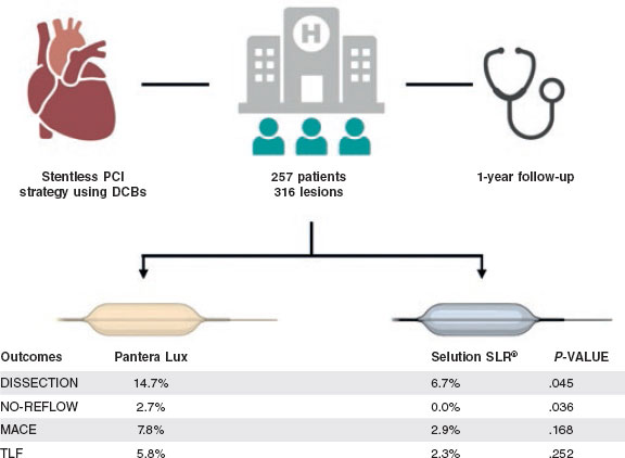 Figure 2. Central illustration. Study design and main outcomes. A total of 257 patients with 316 de novo coronary lesions were treated using a stentless percutaneous coronary intervention strategy with DCB and 1-year follow-up. Outcomes were compared between the Pantera Lux (PCB) and SELUTION SLR (SEB). SELUTION SLR was associated with fewer procedural complications, including lower rates of coronary dissection and no-reflow, with comparable clinical outcomes at follow-up. CV, cardiovascular; MI, myocardial infarction; MACE, major adverse cardiovascular events; PCI, percutaneous coronary intervention; TLF, target lesion failure.
