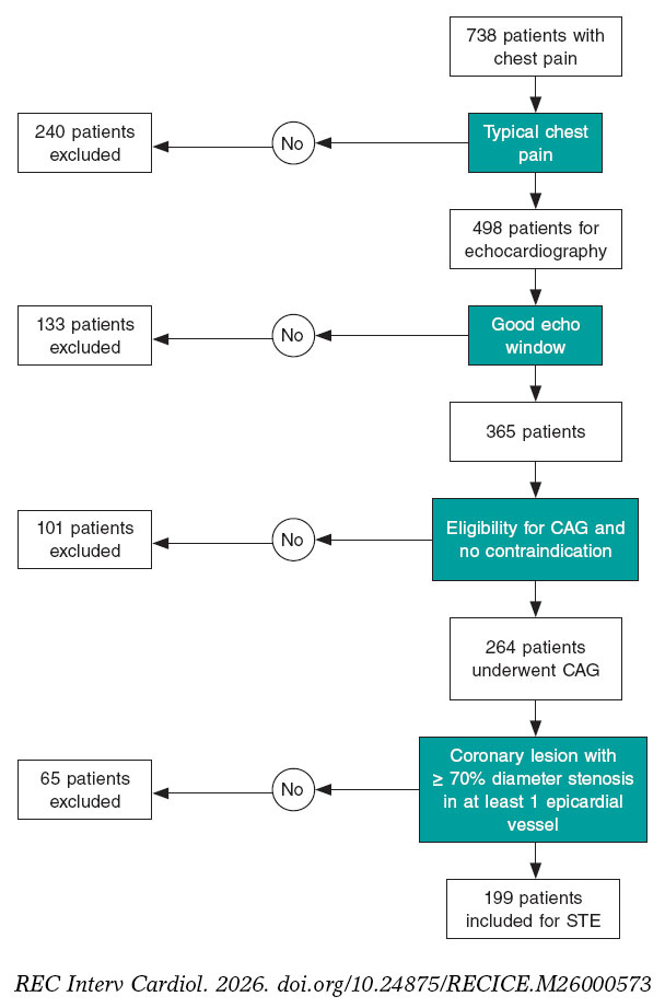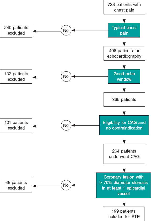 Métodos: Se incluyó a pacientes con dolor torácico y se excluyó a aquellos con infarto de miocardio, arritmia, angiografía coronaria normal, intervención coronaria percutánea o cirugía de revascularización aortocoronaria previas, o ventana ecocardiográfica deficiente. De los 738 pacientes incluidos se seleccionó a 199 con EAC estable, a los que se realizó una ecocardiografía con rastreo de marcas.