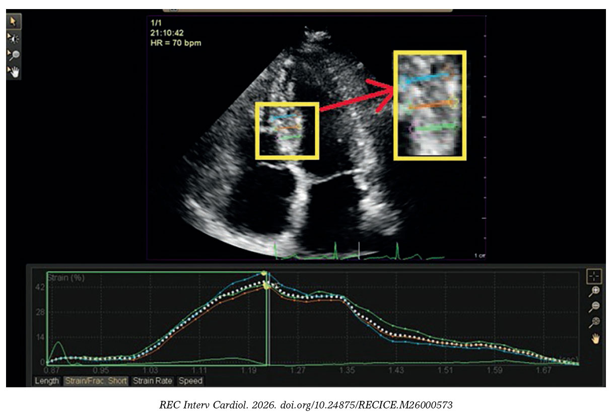 Our study was a cross-sectional, open-label, single cohort, single center study. The echocardiographic assessment outcomes were coded, and data were analyzed with the SPSS v29 software package (IBM, United States). Shapiro-Wilks test was used to assess normality of data. Qualitative data was expressed as frequencies (number of cases) and relative frequencies (percentages), and quantitative data as means, standard deviations, medians, and interquartile ranges. Comparisons of parametrically distributed quantitative variables were performed using the Student t test or analysis of variance (ANOVA), whereas nonparametrically distributed quantitative variables were compared using the Mann-Whitney test, and between qualitative variables using the chi-square test or Fishers exact test, as appropriate.13,14 Inter- and intra-observer variability was assessed by reanalyzing the data of 18 randomly selected study participants and reported as intraclass correlation coefficient (ICC), whose scale ranges from 0 to 1 where 1 represents perfect reliability with no measurement error and 0, no reliability. An ICC value < 0.5 indicates poor reliability; 0.5-0.75, moderate reliability; 0.75-0.9, good reliability; and > 0.90, excellent reliability.15 The area under the curve (AUC) was constructed to detect the cutoff for optimal sensitivity and specificity of regional strains. Receiver operating characteristic (ROC) curve comparison was performed using MedCalc version 10.3.1.0 (MedCalc Software, United States). Confidence interval was set to 95% and the accepted margin of error at 5%. 01. A P value <05 was considered statistically significant, and a P value < .01 was considered highly significant. Final analyses were conducted according to the per-protocol approach.