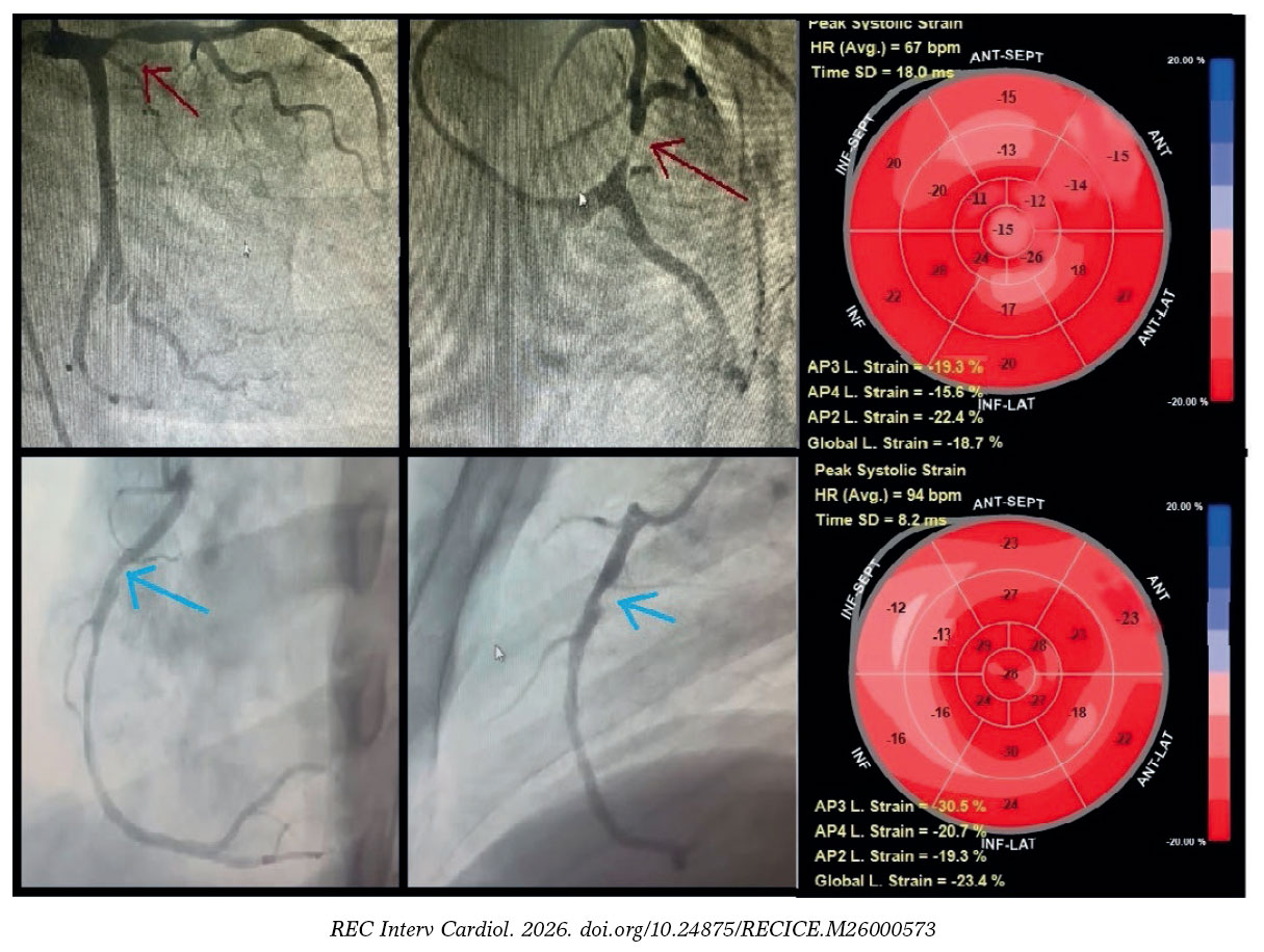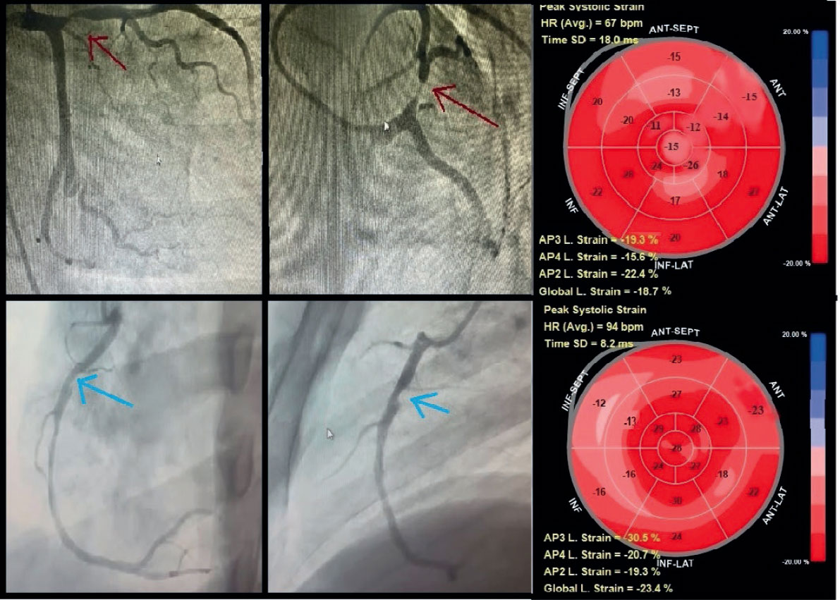 Figure 4. Territorial longitudinal strain of study participants with stable coronary artery disease. Top row: representative study participant with significant proximal left anterior descending coronary artery lesion (≥ 70% diameter stenosis; red arrow). Global longitudinal (L) strain was -18.7%. Seven segments within the left anterior descending coronary artery territory (anteroseptal, anterior regions, and apex) demonstrated impaired strain (≥ -16%), consistent with a true-positive finding, whereas left circumflex and right coronary artery territories showed preserved strain (< -16%), consistent with true-negative findings. Bottom row: representative of a study participant with a significant proximal right coronary artery lesion (≥ 70% diameter stenosis; blue arrow). Global longitudinal strain was -23.3%. Four segments within the right coronary artery territory (mid, basal inferior, and inferoseptal) demonstrated impaired strain (≥ -16%), consistent with a true-positive finding, whereas left anterior descending artery and left circumflex artery territories showed preserved strain (< -16%), consistent with true-negative findings.