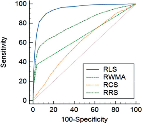 Results: Regional longitudinal strain (RLS) identified significant stenosis in at least 1 of the coronary arteries with sensitivity and specificity rates of 89.4% and 87.8%, respectively, and an area under curve (AUC) of 0.947 (P < .001). Receiver operating characteristic curve comparison demonstrated RLS had the highest predictive value for identifying significant stenosis with an optimal cutoff of ≥ -16% compared with regional radial strain (RRS) (AUC difference, 0.149; 95%CI, 0.132-0.167; P ≤ .0001), regional wall motion abnormality (RWMA) (AUC difference, 0.277; 95%CI, 0.262-0.293; P ≤ .0001), and regional circumferential strain (RCS) (AUC difference, 0.348; 95%CI, 0.327-0.368; P ≤ .0001).