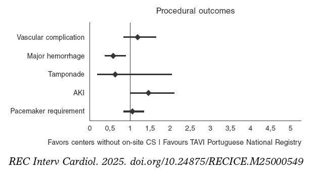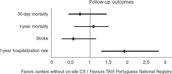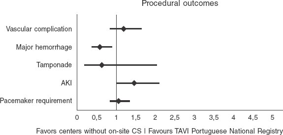 Figure 2. Forest plot of procedural outcomes comparing our center without on-site CS backup with the national Portuguese TAVI registry16 (centers with on-site CS backup).