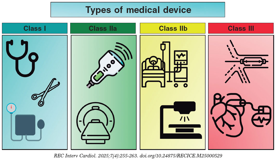 Although the use of MD is ubiquitous in the medical field, health care personnel are rarely familiar with the nomenclature and definitions that apply to them. Table 1 briefly illustrates the main terms we will be using in this document. Although, in Article 2, the EU-MDR clearly defines the terminology to be used,1 it is convenient to expand on some definitions to fully understand the nuances of MD development. The risk classification of MD takes into consideration the intended purpose of the device and its inherent risks (EU-MDR, Annex VIII,1 and European Commission guidance6). Devices can be categorized as low (class I), medium (class IIa), and high risk (class IIb and class III), and in the case of in vitro diagnostic medical devices, as classes A, B, C, and D, with class A being the lowest risk and class D the highest risk. Although class I devices that are considered simpler can be self-certified by the manufacturer, other class I devices (that are sterile or have a measuring function) and class IIa, IIb, and III devices must undergo a conformity assessment requiring the participation of a NB. Implantable devices and those in direct contact with the circulatory system are all defined as high risk (class III); 40% of these are for cardiovascular application.7 Figura 2 illustrates some examples of the different classes of devices, which are defined as: