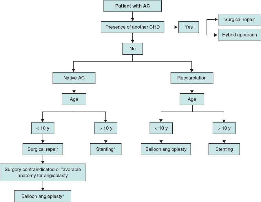 In adolescents and adults, if the anatomy is adequate and there is no accompanying CHD requiring surgical repair, percutaneous stenting is currently considered the first-line therapy.25 These considerations will depend on the patient’s individual anatomic characteristics. Additionally, each center’s experience with these cases will influence clinical decision-making.