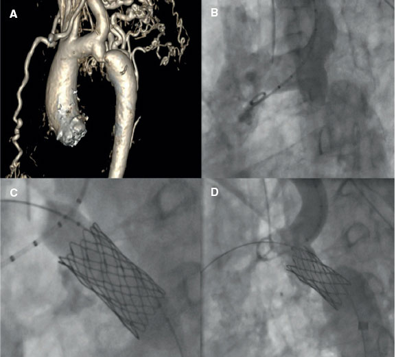 Figure 2. A successful treatment of aortic coarctation in an adult. A: computerized tomography showing aortic coarctation. B: angiography confirming aortic coarctation. C: balloon angioplasty and stent implantation. D: final fluoroscopic result after stent implantation.
