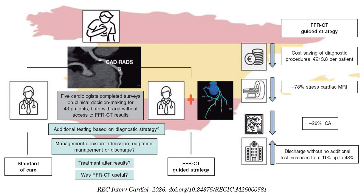 We evaluated the potential clinical and economic impact of integrating FFR-CT into the routine practice in Spain vs standard care in patients with moderate stenosis on coronary computed tomography angiography (CCTA). We conducted a retrospective, observational, single-center intervention simulation study including outpatients with stable chest pain who underwent CCTA from July 2021 through December 2022 at a Spanish university hospital. Eligible patients had lesions classified as CAD-RADS 2.0 grade 3 (50%–69% stenosis) in vessels ≥ 1.5 mm,2 body mass index (BMI < 35 kg/m2) and coronary artery calcium score < 1000 Agatston Units (AU). Patients were identified through administrative databases, and electronic health records were reviewed to collect baseline clinical and imaging data. CCTA reports were independently reviewed by 5 clinical cardiologists, who recommended additional tests or treatments according to their clinical judgment. The same process was repeated after incorporation of FFR-CT to determine how functional information influenced decision-making. For each scenario, cardiologists answered questions, both before and after FFR-CT analysis: 1) What additional diagnostic tests would you request? 2) Would you recommend hospital admission, outpatient management, or discharge? 3) What treatment strategy would you propose? 4) Was the FFR-CT information useful? (figure 1). This structure enabled direct comparison of anatomical-only decisions vs those incorporating functional data. Significant FFR was defined as at least 1 vessel with FFR ≤ 80%.