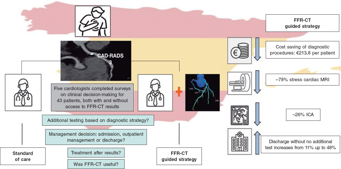 In conclusion, in this simulation study, incorporation of FFR-CT in patients with stable chest pain and moderate coronary stenosis on coronary CCTA was associated with reduced downstream testing, lower health care costs, and higher discharge rates within the Spanish National Health System.