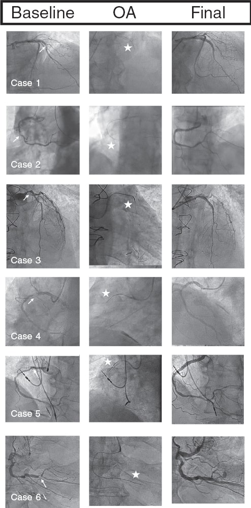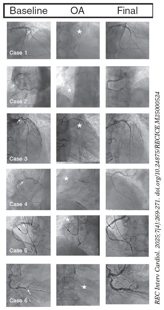 In all our cases, OA was successful, with the crown crossing the lesion and allowing subsequent angioplasty without major complications. Figure 1 illustrates the angiographic images of each case.