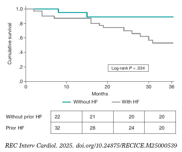In the analysis of variables, only prior HF was significantly associated with higher overall mortality, all-cause readmissions, and higher risk of HF decompensation during follow-up (table 1). The Kaplan-Meier curve showed a higher proportion of decompensations in patients with previous HF during follow-up (figure 1). Statistical significance was not reached for mortality or readmission. In multivariate analysis, prior HF was the only variable significantly associated with HF decompensation (adjusted hazard ratio, 5.4; 95%CI, 1.2-24.1; P < .026).