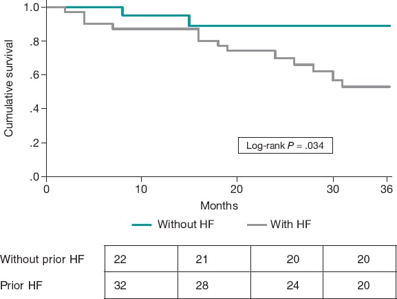 Figure 1. Kaplan-Meier curve for the event of heart failure (HF) decompensation during follow-up based on the presence of prior HF.
