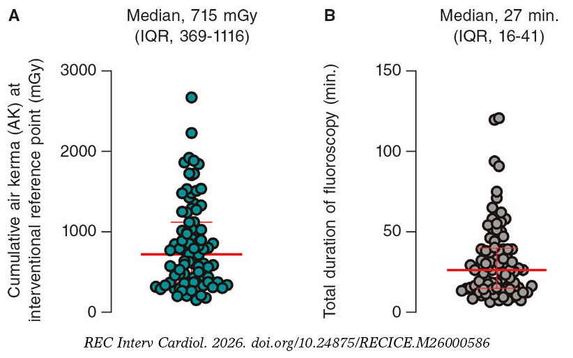Importantly, our data show that median AK at the interventional reference point was 715 mGy (369-1116) with a total fluoroscopy time of only 27 minutes (16-41), as shown in figure 1. This yielded a normalized AK/fluoroscopy-time ratio of approximately 26.5 mGy/min. Within this cohort, the low-frame-rate workflow was feasible and adopted as a routine practice without apparent compromise in procedural conduct. However, given the absence of a contemporary control group and the lack of formal image quality assessment, no comparative inference can be made regarding procedural time, contrast volume, or visualization relative to standard fluoroscopy settings.