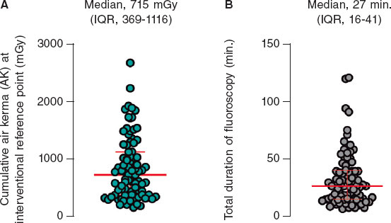 Figure 1. A: median cumulative air kerma at interventional reference point (in mGy); B: median total fluoroscopy time (minutes). IQR, interquartile range.