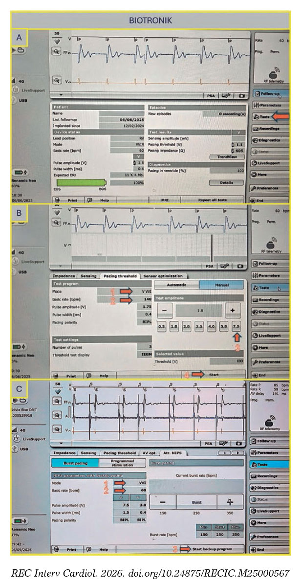 No todos los modelos de marcapasos están preparados para la realización de pruebas electrofisiológicas. No obstante, esta limitación se puede superar empleando la sección de medición de umbrales. Elija “Test”, luego “Pacing Threshold” y elija “Manual” (figura 1A-B). Primero, elija el modo de estimulación (por ejemplo, VVI), luego la frecuencia de estimulación deseada (hasta 200 lpm) y asegúrese de que la salida esté configurada al máximo (7,5 V) para garantizar una captura adecuada. Después de configurar todos los parámetros, pulse “Start” para iniciar la estimulación, que se prolongará hasta que esta se detenga manualmente. Si el dispositivo admite estimulación rápida y programada no invasiva (EPNI), puede realizarse sobreestimulación en modo VVI o V00 (figura 1C). Elija el modo y la frecuencia básica deseados y pulse “Start Backup Program”.