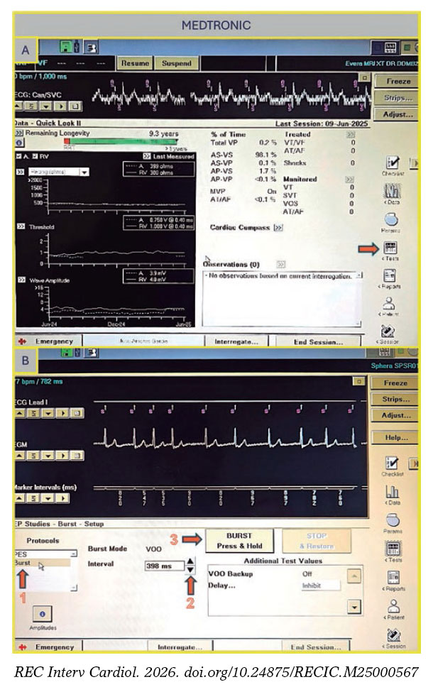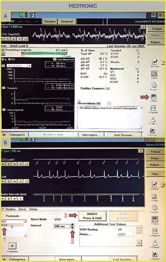 Figura 2. A: pantalla principal de la consola Medtronic. Pulse “Tests” (flecha) para acceder a la pantalla del estudio electrofisiológico. B: elija “Fixed Burst” o “Burst” (flecha 1), ajuste el intervalo que necesita (flecha 2) y mantenga pulsado el botón “Burst” (flecha 3) para administrar la estimulación.