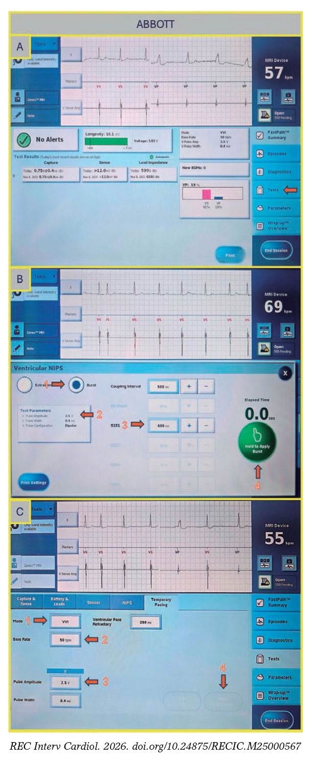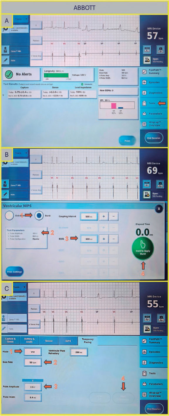 Figura 3. A: pantalla principal de la consola Abbott/St. Jude. Pulse “Test” para acceder a la pantalla del estudio electrofisiológico. B: pantalla de EPNI ventricular. Seleccione “Burst” (flecha 1), ajuste la amplitud (flecha 2), configure el intervalo S1–S1 (flecha 3) y pulse el botón verde para administrar la estimulación (flecha 4). C: pantalla de estimulación temporal. Seleccione el modo de estimulación (flecha 1), la frecuencia deseada (flecha 2) y la amplitud del pulso (flecha 3); luego pulse el botón “Start Temporary” (flecha 4).