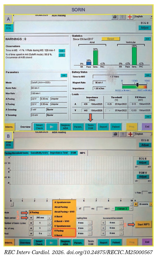 Figura 4. A: pantalla principal de la consola Sorin. Elija “Tests EGM” (flecha) para acceder a las opciones de estimulación. B: pantalla “Tests EGM”. Seleccione el modo de estimulación (flecha 1), el periodo del intervalo (flecha 2) y pulse el botón “Start NIPS” (flecha 3).